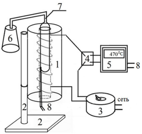 The laboratory setup for coking heavy oil residues: reactor and coking oven (1); furnace mounting bracket (2); step-down voltage transformer (3); relay switch (4); temperature control controller (5); receiving container for distillate (6); container for loading raw materials (7); and thermocouple (8).