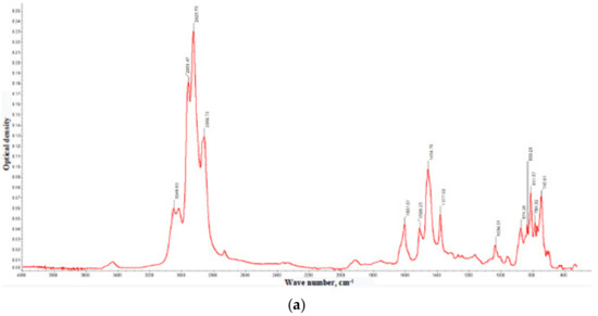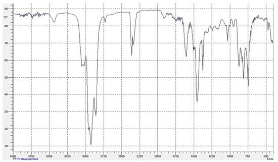 We have studied the original gasoil with the set of absorption spectroscopy techniques, UV-vis and FTIR, using spectrometer Shimadzu IRAffinity-1S. Gas oil and its fractions with the boiling points <450 °C were deposited as a thin film on the KBr plates. In the case of the fraction >450 °C, its toluene solution was applied to the transparent plate, which was then dried at 100 °C. The IR spectrum of the gasoil is shown in Figure 2. The IR features of the gasoil fractions are presented in Figure 3. The associated numerical data are collected in Table 4 and Table 5.