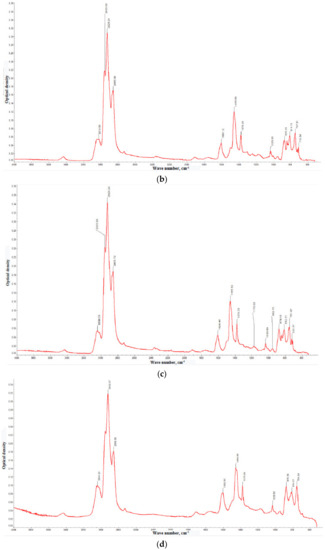 IR spectra of the gasoil fractions with boiling points: <350 °C (a), 350–400 °C (b), 400–450 °C (c), and >450 °C (d). The comparison of the optical densities at the characteristic IR bands are collected in Table 5.