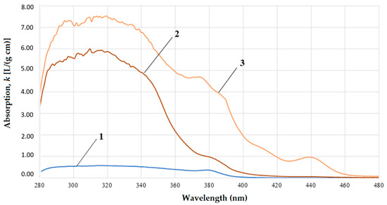 UV-vis spectra of the gasoil fractions: lower 350 °C (1); fraction 350–400 °C (2); and fraction 400–450 °C (3).