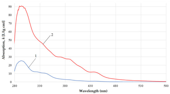 Optical electronic absorption spectra of the gasoil and its fractions were studied by phenomenological methods without isolating individual bands from a wide spectrum signal [25,26]. In line with these techniques, we focused on the broadband signals, which could be informative for assessing the average parameters relating to the electronic structure of the molecules. The UV-vis spectra in the absorption range 280–580 nm were registered with spectrophotometer SF 2000-1, which allows measurements in the UV and visible regions (Figure 4).