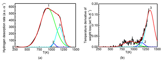 Processing (using the technique [20]) of thermal desorption (TDS) and thermogravimetric (TG) data from [5] for “super” desorption of “irreversible” hydrogen from GNF samples with a herringbone structure (see Figure 2 in [5]). (a) Fitting by three Gaussians (peaks ##1–3) of the TDS spectrum (β = 0.17 K s−1) for samples subjected to hydrogenation in gaseous H2 (at 300 K, 11–4 MPa, 24 h); the red curve corresponds to the sum of three peaks. (b) Fitting by three Gaussians (peaks ##1–3) of the temperature derivative of the TG spectrum for samples subjected to hydrogenation in gaseous H2 (at 300 K, 11–4 MPa, 24 h) and subsequent heating (β = 0.17 K/s) in He; the red curve corresponds to the sum of three peaks.