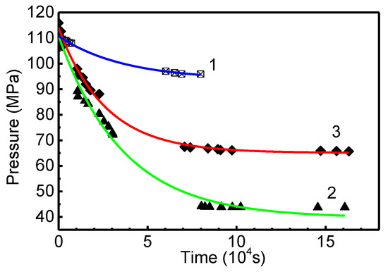 As follows from the results of processing the kinetic data from [4] on the change in hydrogen pressure in the working chamber during the “super” adsorption of “reversible” hydrogen (at a temperature of about 300 K) for three samples (nos. 1, 2, and 3) of graphite nanofibers with a herringbone-type structure shown in Figure 2, the process proceeds as a first-order reaction with rate constants: K1ads.rev. = 2.7 × 10−5 s−1, K2ads.rev. = 3.8 × 10−5 s−1 and K3ads.rev. = 2.8 × 10−5 s−1, respectively. The characteristic time of “super” adsorption of “reversible” hydrogen (tads.rev. = Kads.rev.−1) here was about 9 h, and the hydrogenation time of the samples was 24 h.