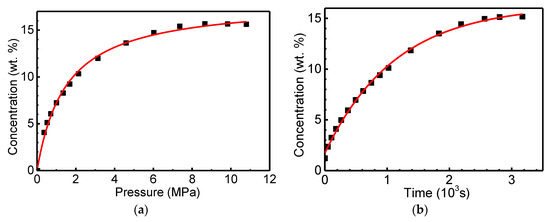 Processing of thermodynamic and kinetic data from [10] on the “super” sorption of “reversible” hydrogen (~15 wt.%) for GNF samples with a “plate” structure (see Figure 4) subjected to hydrogenation (24 h) in gaseous molecular hydrogen (at a pressure of 12 MPa and a temperature of 300 K) and subsequent dehydrogenation with a decrease in hydrogen pressure to 0.1 MPa: (a) processing of adsorption data in the approximation of the sorption isotherm of the Henry–Langmuir type [17]; (b) processing of thermal desorption data in the first-order reaction approximation.