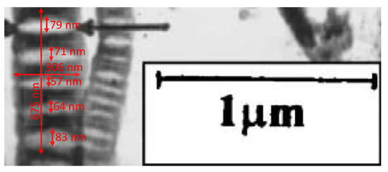 A micrograph of graphite nanofibers [11] subjected to hydrogenation (24 h) in gaseous molecular hydrogen at a pressure of 12 MPa and a temperature of 300 K to a content of “reversible” hydrogen of ~17 wt.%. The sizes of lenticular nanocavities in one of the nanofibers are shown, which are necessary for estimating (see works [2,17,18,24]) the volume of such nanocavities and the density of “reversible” hydrogen localized in them.
