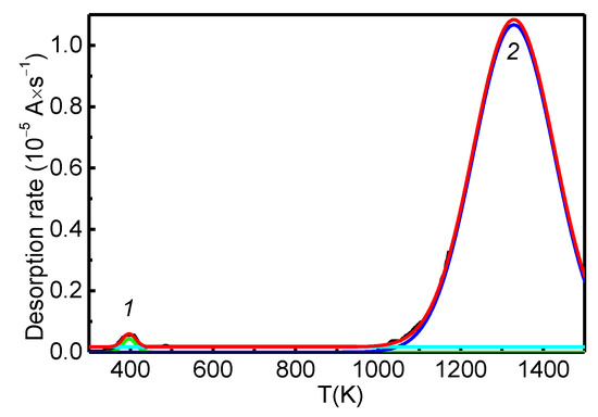 The developed methodology [17,18,19,20,21,22,23] makes it possible to reveal the physics of desorption processes by thermodynamic analysis of the obtained characteristics of thermal desorption peaks and comparison with the corresponding independent experimental and theoretical data. The technique [20] contains several stages of implementation, including the use of some non-standard reliability criteria and the confirmation and/or the final refinement of the results using numerical simulation methods [23].