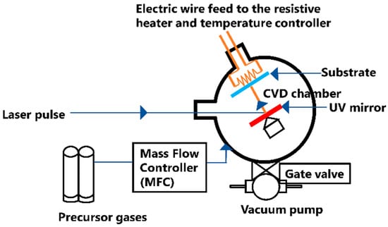 A Nd:YAG laser was used for this research work. The Nd:YAG laser system has four energy levels and can be built in both pulsed and continuous modes. A Xenon or Krypton flash tube is employed as a pumping source [30]. The pulse duration of this laser is 5–7 ns. The principal components of this system are: a traditional pulse laser deposition (PLD) chamber, a solid-state Nd:YAG laser of wavelength 266 nm, mass flow controllers (MFC), a roughing and turbomolecular pump, a baratron gauge, a bourdon gauge, a heater, a temperature controller, a UV mirror, a network of gas supply lines, and the precursor gases (mixture of H2 and Ar gas). For this experiment, two systems were designed as the primary sources of heating: the first one is the use of resistive heating in the chamber and the second one is inductive heating using a quartz tube in an induction furnace. To initiate a deposition, the substrates are placed in the deposition chambers, and it is pumped down from atmospheric pressure to about 5 × 10−5 Torr. Pulsed laser beam incidents on the copper and silicon substrates occurred with the aid of a 248 nm UV mirror for different deposition times of 1–5 min. Figure 1 depicts the deposition process in the chamber.