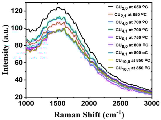 Our main goal was to shorten the CBM deposition time and sharpen the 2D peak by reducing the number of layers. The deposition time was reduced from 5 to 3 and then to 1 min, but there was no significant improvement in the 2D peak. From this, it is concluded that it might not be graphene but rather a graphene-like material. It was observed that the deposited substrate was PyC. It is produced by heating a hydrocarbon (CH4) nearly to its thermal decomposition temperature of around 1000–1200 °C. This thermal decomposition temperature breaks its bonds, releasing carbon-free radicals and allowing graphite to crystalize in the absence of oxygen (pyrolysis) [31]. The surface roughness of PyC films does not vary significantly with film thickness [32], and it is also responsible for quenching the 2D signal in samples Cu11,1, Cu12,1, and Cu13,1, regardless of the deposition time.