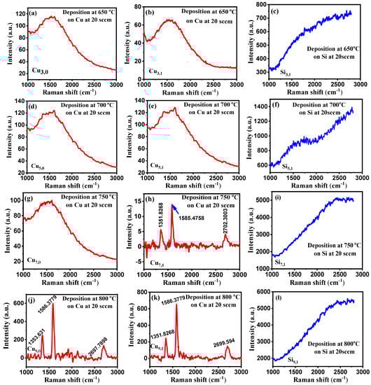 (a–o) Raman spectra at constant CH4 flow rate at 20 sccm with different deposition temperatures on Cu and Si substrates.