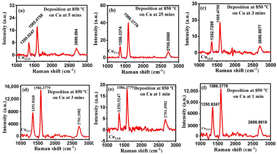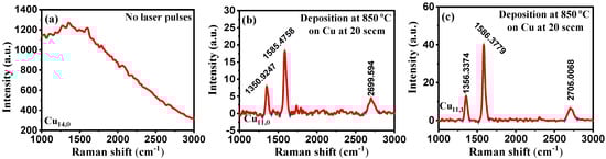 Here, we compared two depositions, one grown by purely thermal CVD and the other by LCVD. The process parameters are shown in Table 2, and the Raman data plots are shown in Figure 6a–c below.