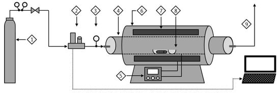 Apparatus for conduction of thermolytic processes on supported ionic liquid membranes: (1) gas cylinder (Ar); (2) mass flow controller; (3) pressure gauge; (4) refractory tube; (5) PID temperature controller; (6) tubular furnace; (7) heating zone; (8) ceramic capsule; (9) vent.