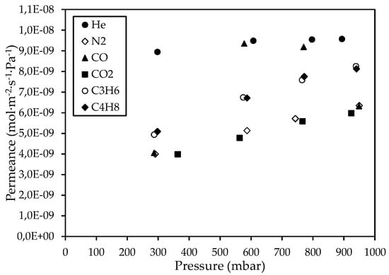 Permeance of He, N2, CO, CO2, C3H6, and C4H8 gases through the CΜ_1 membrane at 25 °C, with respect to the pressure.