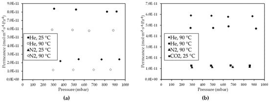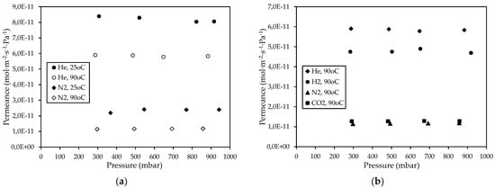 Permeance of (a) H2 and Ν2 gases at 25 and 90 °C and (b) H2, He, Ν2, and CO2 gases at 90 °C, through the CΜ_3 membrane, as a function of the pressure.