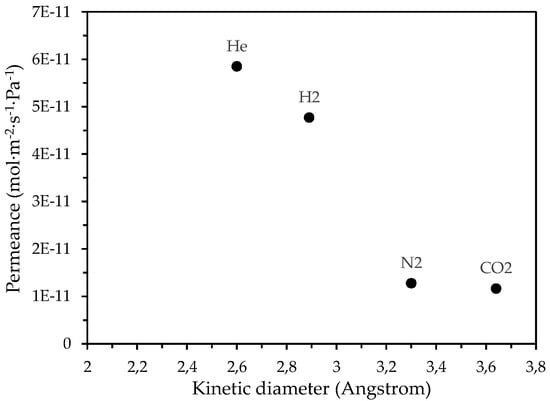 Furthermore, as the temperature increased from 25 °C to 90 °C, He and N2 permeance through the CM3 membrane was reduced, as shown in Figure 5a. For both He and N2, this reduction can be attributed to the dominance of the Knudsen diffusion type, wherein the gas permeance is inversely proportional to temperature []. In any case, the mean ideal selectivity values (with respect to Helium) over the entire pressure range for the CM3 at 90 °C were higher than the corresponding Knudsen ideal selectivities and higher than the respective ones at 25 °C (Table 4). A drastic reduction in permeance of He, N2, and CO2 gases at 90 °C by almost two orders of magnitude has also occurred in the case of the CM3 membrane with regard to their permeation through the CM2 membrane, as shown in the results presented in Figure 3 (for CM2) and Figure 5b (for CM3). In addition, from the results derived at 90 °C for the CM3 (Figure 5b), it is evident that for all applied pressures, the permeance of the supplied probe gases depended on their kinetic diameter (Figure 6), thus indicating that gas diffusion takes place primarily through the microporous carbon film formed on the outer side of the CM3 membrane.