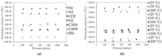 Permeance of (a) He, N2, CO2, H2, C3H6, C4H8, and SF6 gases at 25 °C and (b) He, Ν2, CO2, and SF6 gases at 25, 70, and 100 °C, through the CM4 membrane, as a function of the pressure.