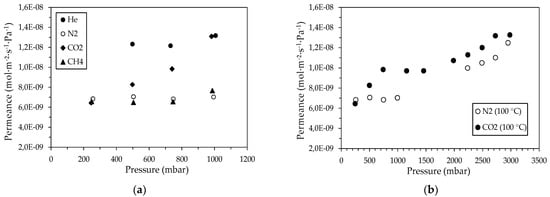 Permeance of (a) He, Ν2, CO2, and CH4 gases at 100 °C and (b) Ν2 and CO2 gases at 100 °C, through the CM5 membrane, as a function of the pressure.