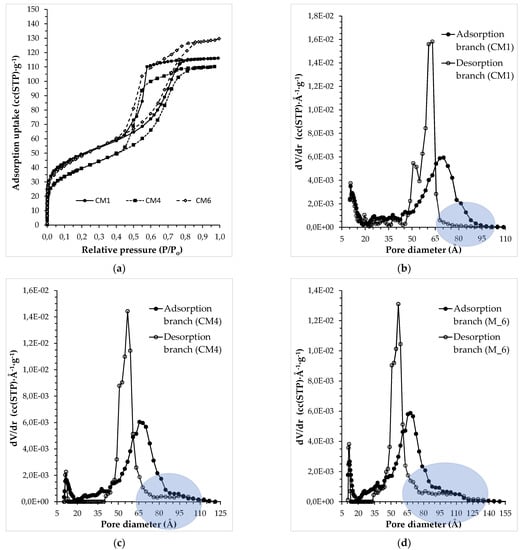 The PSD curve of the CM1 desorption branch showed a bimodal peak within the mesopore size range, which in the case of the CM4 and CM6 membranes turned into a single peak (Figure 10b–d).