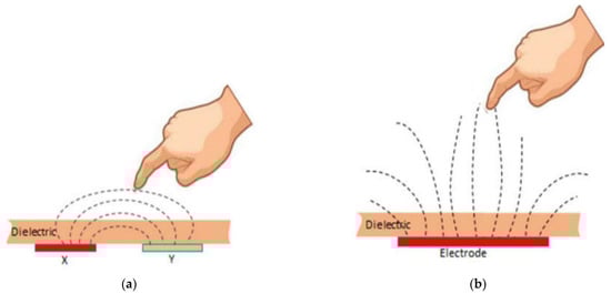 Schematic of two basic CPT sensors [31]: (a) mutual capacitance sensor, and (b) self-capacitance sensor.