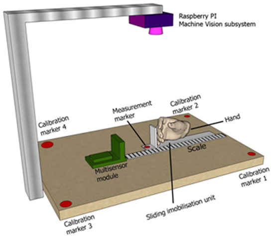 A recent study looked at the usage of a noninvasive omnidirectional CPS developed in-house as a possible option for human–machine interaction applications [78]. The performance of the proposed sensor was compared to that of infrared, time-of-flight, and ultrasonic sensors, all of which are routinely employed in comparable applications. The suggested sensor is based on a heterodyning approach employed in theremin, which consists of two digital oscillators, one of which is coupled to a sensing (conductive) plate (primary/sensing). If a grounded item enters the detecting range, the oscillator’s total capacitance rises, affecting the frequency of the produced square wave. In our tests, we employed a 10 × 10 cm2 thin copper PCB square as a sensor plate. The detecting plate is linked to the main oscillator, which has a fixed 10 kΩ resistor in the feedback line. Any grounded item put within the sensing range will add capacitance to this oscillator, causing it to shift frequency by some amount. A measuring system is built to verify the performance, as shown in Figure 5. The camera is used to compute the displacement of the user’s hand from the sensor module in this arrangement. They concluded that the sensing mechanism may be extended to all directions surrounding the detecting element by using an omnidirectional CPSs, such as the one described in their study. In addition, the suggested capacitive sensor’s range (4–11 cm) is greater than that of comparable capacitive sensing technologies. The power usage was further decreased to 5 mW by duty-cycling the power supply while still allowing 50 readings per second to be acquired.