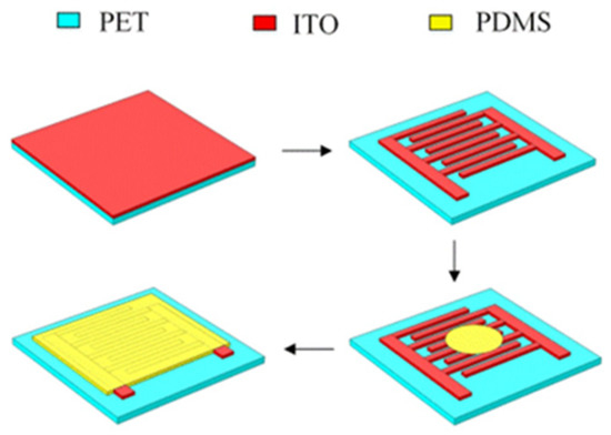 Ref. [85] describes a flexible CPS with great transmittance and sensitivity. An interdigital capacitance (IDC) structure is developed using a polydimethylsiloxane (PDMS) sensing layer to cover indium tin oxide (ITO) electrodes interdigitated on a polyethylene-terephthalate (PET) substrate. They studied the pressure and proximity sensing capabilities of the constructed IDC-based CPS sensor, resulting in a maximum sensing distance of 200 mm. Figure 8 illustrates the manufacturing process of the proposed sensor. To construct the sensor, a PET sheet with a thickness of 0.125 mm was employed as the flexible substrate, which was then coated with ITO film. Second, laser etching was used to form the coplanar ITO interdigital electrodes. Third, the Dow Corning 184 prepolymer was mixed with the curing agent at a 10:1 weight ratio for 15 min and then spin-coated on the ITO electrodes for 31 s at a speed of 1500 rpm. Next, the sensor was degassed for 31 min in a vacuum desiccator to eliminate any air bubbles embedded in the sensitive film. It was then cured at 70 °C for over an hour to generate the sensor’s final shape.