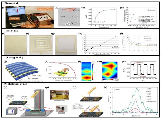 Measurement setup and the results proposed by Refs. [15,79,81,88]: (a) touchless piano being played optically with a human finger hovering 40 mm above the keyboard, (b) schematic representation of sensor sensing, (c) increase in relative capacitance with response to an approaching object, (d) performance comparison of the proposed setup with previous works, (e) printed proximity sensors on fabric with filled design, (f) printed proximity sensors on fabric with spiral design, (g) printed proximity sensors on fabric with loop design, (h) maximum detection distance as a function of the proximity sensor width, (i) capacitance change simulation via COMSOL, (j) sandwich structure of CPS with the AgNWs stripes serving as the row and column electrodes, placed orthogonally on the top and bottom PET substrates, (k) capacitance variation as a function of vertical distance from the intersection, (l) contour graphics depicting the estimated capacitance change profile of a center pixel and its four closest neighbors with varying degrees of sensitivity, (m) proximity sensing depiction of two metal bars, the intersections of which are denoted by dashed black boxes, (n) relative capacitance change vs. response time during four cycles, (o) a schematic representation of a TPU/carbon nanotube proximity sensor configuration, (p) noise minimization using semi-planner 45° probes, and (q) mutual capacitance becomes apparent when an item is moved near to the sensor. Shunting the initial electric lines results in a highly strong and distributed fring field between the object, film, and probes, resulting in a dramatic decrease in capacitance. (r) Comparing the maximum sensitivity of various weight percentages of carbon nanotubes (CNTs).