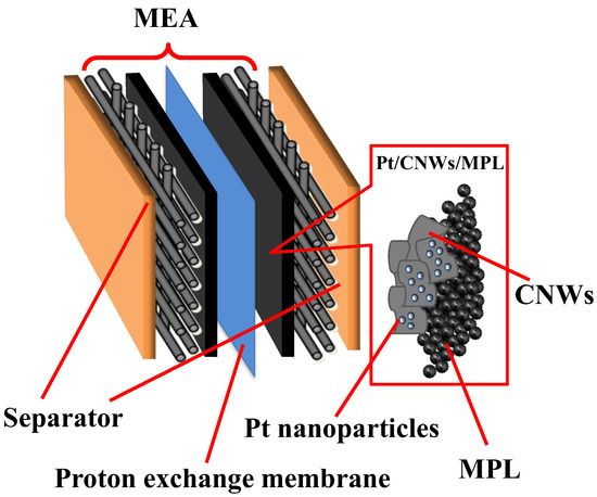 Figure 2 shows a schematic diagram of the single PEFC, which was assembled with a membrane electrode assembly (MEA) and separators. The MEA consisted of the Pt-supported CNWs on MPL/CP, ionomer dispersion solution, and non-treated ionomer membrane (Nafion 117) for proton exchange. The surface of the CNWs on the MPL/CP was treated with atmospheric pressure plasma to endow hydrophilicity. The Ar gas flow rate was 2.0 sccm, the applied voltage to the electrodes was 6 kV, and the treatment distance was 5 mm. Pt nanoparticles were supported on the surface of the CNWs/MPL/CP by the liquid-phase reduction method using chloroplatinic acid solution (H2PtCl6, 8 wt.% in H2O) and NaBH4 as the reducing agents. A total volume of 0.1 mL ionomer dispersion solution (Nafion DE202) diluted with 2-propanol was applied dropwise on the Pt/CNWs/MPL/CP. The MEA was fabricated by hot-pressing at 135 °C with a pressing pressure of 5.0 MPa and pressing time of 90 s. The MEA with an electrode area of 5 cm2 was assembled to the standard single PEFC (Electro Chem, Inc., EFC-05-02, Woburn, MA, USA). The power generation characteristics were investigated using a fuel cell test system (Scribner Associates Inc., AutoPEM, Southern Pines, NC, USA) at an anode H2 gas flow rate of 0.1 L/m, cathode air flow rate of 0.2 L/m, and a temperature of 80 °C.