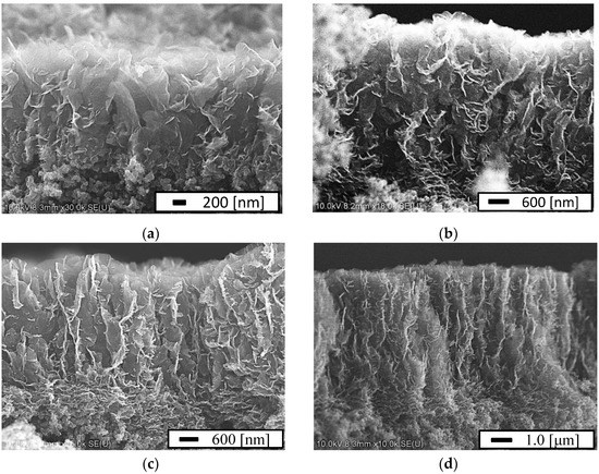 Figure 3 shows the height of the CNWs as a function of the growth time for condition (1). The height of the CNWs increased from 1.7 µm to 7.2 µm as the growth time increased. The growth rate was estimated as 28 nm/min. Figure 4 shows the SEM images of the CNWs for various growth times. The CNWs were directly formed on the MPL of carbon black as shown in Figure 4a. The growth mechanism of CNWs on the substrates was detailed in a previous report [80]. The growth was as follows: (1) A very thin amorphous carbon layer formed on the substrate. (2) A nucleation site was formed there by ion irradiation. (3) Nanoislands were formed by aggregating carbon radicals at the nucleation site. (4) The nanoislands were irradiated with ions, and the absorption of carbon radicals was enhanced. (5) Nanographene grew preferentially in the height direction to form carbon nanowalls. In this study, the flake-like CNWs grew on the MPL, and some branches grew from the flake-like CNWs after 3 h.