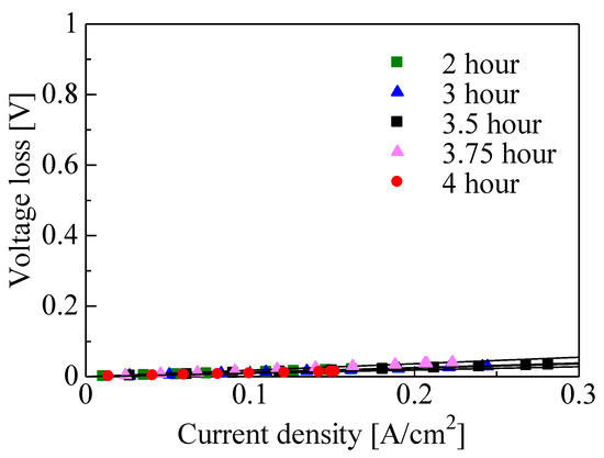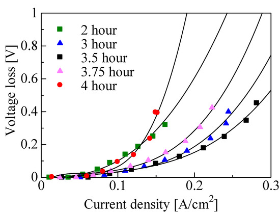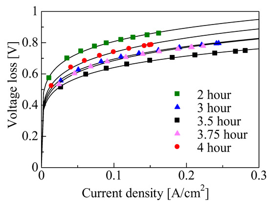 Figure 8 shows the voltage loss due to diffusion polarization for the various growth times. The diffusion polarization of an electrode is a result of the formation of a diffusion layer for fuel gas at the three-phase boundary or the water as a byproduct of an oxygen reduction reaction. Diffusion polarization can be calculated using the following equation: