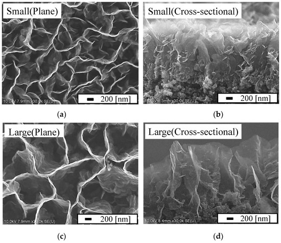 Figure 9 shows plane or cross-sectional SEM images of the CNWs for different gap areas. The CNWs with a small gap area (0.37 µm2) were deposited under condition (1), and those with a large gap area (0.79 µm2) were obtained under condition (2). The growth time to achieve a height of 1.6 µm was 2 h for condition (1) and 70 min for condition (2) since the influence of the secondary growth can be suppressed under relatively low height. Here, the gap area of CNWs was evaluated from the area enclosed by the walls as their reciprocal [87].