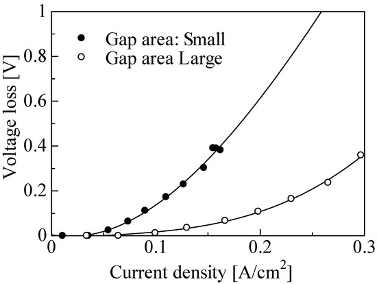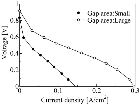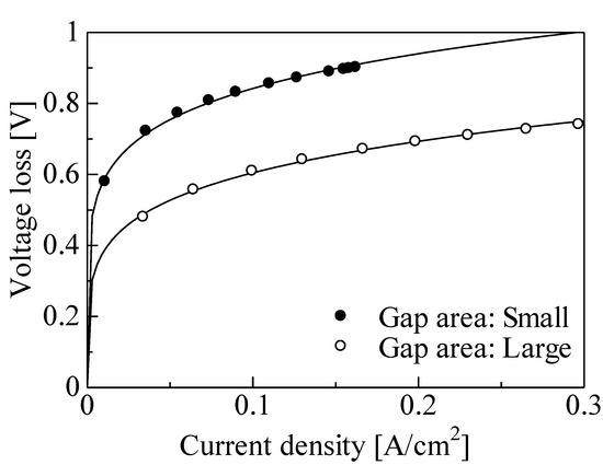 Figure 10 shows the V–J curve of a single PEFC for the different gap areas. Three gradients, due to activated polarization, resistance polarization, and diffusion polarization, were observed on the large gap area. The voltage of approximately 0.91 V at a current density of 0 mA/cm2 was obtained for a large gap area under relatively low height. Moreover, the maximum current density for a large gap area was larger than that with a small gap area and was increased from approximately 0.15 to 0.3 A/cm2 at the same height. Figure 11 shows the voltage loss due to activated polarization for the different gap areas. The voltage loss due to the activated polarization for the large gap was smaller than that for the small gap. The difference was approximately 0.2 V regardless of the current density. These results indicate that the three-phase interface region increased with the increase in gap area since the supply of platinum or ionomer dispersion solution to the bottom of the CNWs may have been enhanced. Figure 12 shows the voltage loss due to diffusion polarization for the different gap areas. The voltage loss due to diffusion polarization for the large gap was improved to be approximately 4 times smaller than that for the small gap. This result indicates that the supply of fuel gas to the three-phase interface and the discharge of water molecules were drastically improved by enlarging the gap of CNWs.