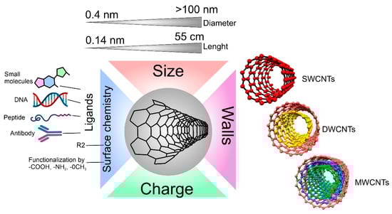 One of the most important parameters of the CNTs is the number of concentric walls (Figure 1). The number of walls primarily determines the diameter of the CNTs. For example, single-walled carbon nanotubes (SWCNTs) have a small diameter (usually 1–2 nm), while multi-walled carbon nanotubes (MWCNTs) reach a diameter of up to 100 nm. Ref. [] However, an increase in the number of walls also increases the number of defects, thus facilitating their modification and functionalization. Double-walled carbon nanotubes (DWCNTs) are located in the middle and are also quite promising since the diameter is still quite small, mechanical properties and electrical conductivity remain high due to the inner layer, but their surface modification is also possible due to the second wall [].