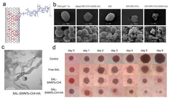 (a) Schematic representation of EPI-SWCNTs-DSPE-HA. (b) The surface morphology of A549/Taxol tumor spheroids after treatment with different formulations visualized by SEM on day 3. The first and second lines show full (×300) and magnified images (×5000) of the spheroid. Reprinted with permission from Elsevier []. (c) Transmission electron microscopy (TEM) image of functionalized SWNTs. Scale bar = 200 nm. (d) The CSCs mammospheres images treated with different SAL-containing formulations under an inverted microscope. The scale bar was 100 μm. Reprinted with permission from Elsevier [].