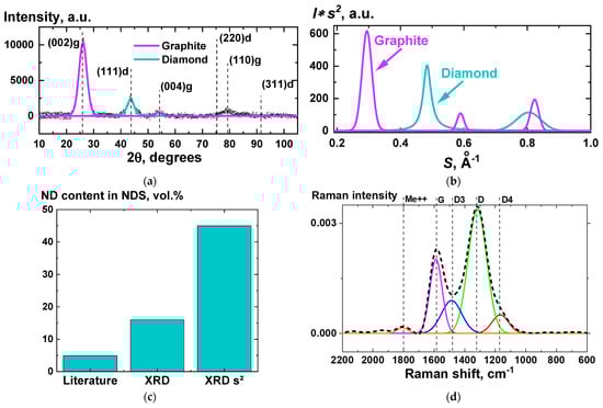 Figure 4c. According to the literature, the volume fraction of the NDs in NDS is 4.9 vol.%. Taking into account that this value was obtained using the weighting procedure after purification of NDs, which can lead to a significant decrease of the initial NDs weight value, the real ND content in NDS can be much higher. According to the XRD analysis, the volume fraction of ND in NDS can be estimated as either 16 vol.%, or 45 vol.%, depending if the Ruland’s method [