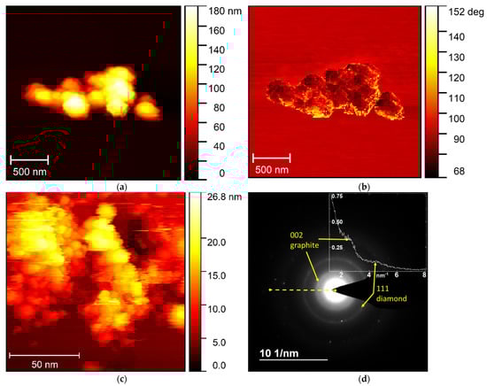 Figure 5d), two characteristic reflexes can be observed, corresponded to the graphite and diamond phases. From the analysis of the graphite reflex, the distance between 002 planes of carbon atoms in graphite can also be evaluated. The obtained value (3.45 ± 0.1) nm was in the range of error from the value taken from the literature [