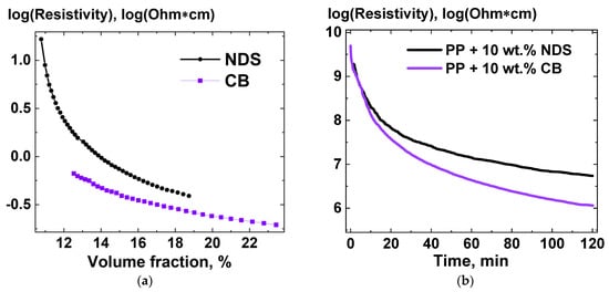 Figure 6a. Additionally, composites, based on PP and containing 10 wt.% NDS and 10 wt.% CB, were subjected to annealing at 205 °C, while the resistivity was constantly measured between the two electrodes in contact with the composite melts. The resulting dependencies of resistivity of the composite melts versus time are presented in
