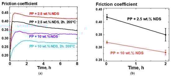 For PP-based composites containing 2.5 and 10 wt.% NDS, dependencies of friction coefficient on time were obtained before and after annealing the composites at 205 °C for 2 h. The averaged friction coefficient values versus time curves for six independent runs are presented in