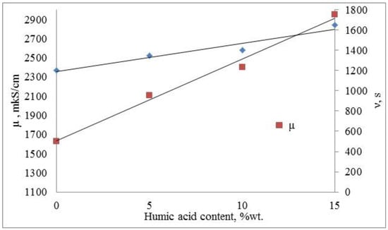 The HESBHM conditional viscosity (ν, s), conductivity dependence, and conductivity (μ, mkS/cm) of hydroxypropyl methylcellulose on the different humic acid contents.