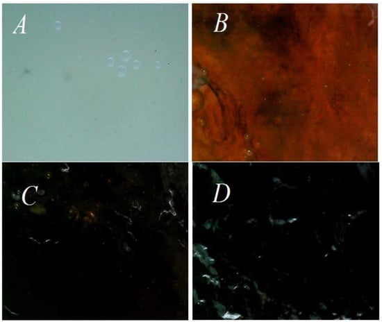 Microscopic studies of HESBHM: (A) pure hydroxypropyl methylcellulose and sodium alginate hydrogel; (B) hydroxypropyl methylcellulose and sodium alginate hydrogel + 5% wt. of humic acid; (C) hydroxypropyl methylcellulose and sodium alginate hydrogel + 10% wt. of humic acid; (D) hydroxypropyl methylcellulose and sodium alginate hydrogel + 15% wt. of humic acid.
