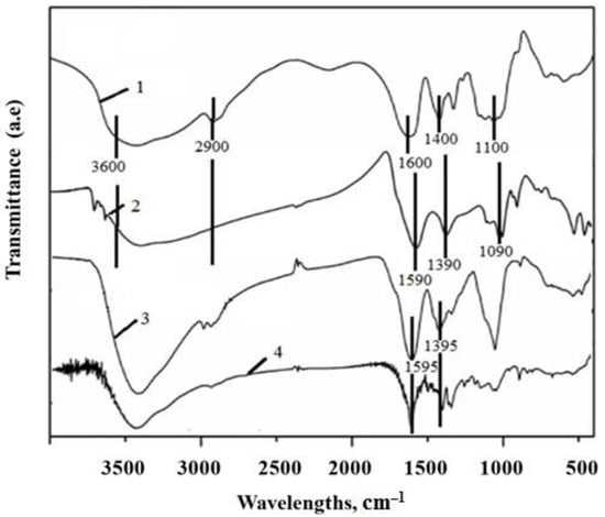IR spectra of humic acids, hydroxypropyl methylcellulose, and hydroxypropyl methylcellulose–humic acids system: 1—hydroxypropyl methylcellulose; 2—humic acids; 3—hydroxypropyl methylcellulose +5% wt. humic acids, 4: hydroxypropyl methylcellulose +10% wt. humic acids.