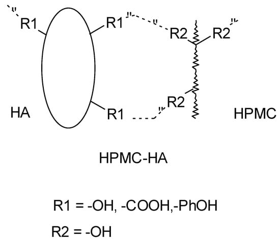 Such changes in the IR spectra are evidence that humic acids react with hydroxypropyl methylcellulose through the multipoint interaction of their carboxyl groups with the hydroxyl groups of the polymer, with the formation of such a structure (Figure 4) [].