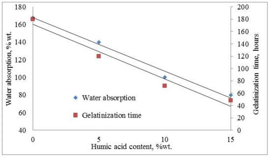 Graphical dependence of water absorption and gelation time of HESBHM based on hydroxypropyl methylcellulose and the humic acid content.