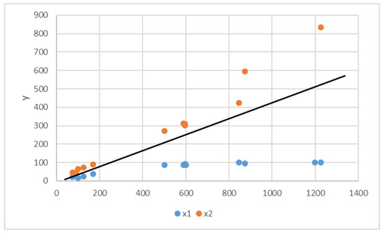 Thus, within the framework of this study, a multiple econometric model of the relationship between biogas yield from different types of organic substance (m3/t)—y and dry organic substance content (kg/t)—x1, and the share of possible methane content in organic substance x2 (m3/t) was built. The initial data were generally accepted indicators of biogas yield and methane content of substrates of plant and animal origin [37,38].