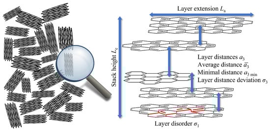 Analogous to the intralayer parameters, an average stacking height (Lc), its polydispersity (κc), an average layer distance () and the standard deviation (σ3) can be defined for describing the interlayer stacking. In addition, the minimal layer distance (a3 min = − da3), the average number of graphene layers per stack (N = Lc/) and the homogeneity of the stacks (η) are physically meaningful parameters []. Additionally, the thermal motion (u3), i.e., in principle the Debye–Waller factor, and the anisotropy of the atomic form factor of carbon (Δan) can be refined but have in most cases only a small influence on the analysis. The preferred orientation parameter (q) might also be refined, it also depends on the experimental setup, Table 2.