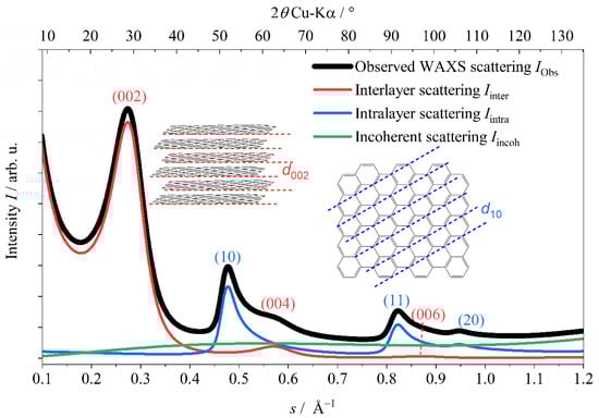 It should be noted that this equation applies to both X-ray and neutron radiation, with only one important difference: while fc features a specific course for X-ray radiation and needs to be suitably interpolated, it is a constant for neutron radiation. Hence, a fixed value of 1 can be assumed for fc in case of WANS, since it is adjusted by the normalization constant k anyway. Icoh can also be expanded to include the concentration of foreign atoms such as hydrogen (cH), nitrogen (cN), oxygen (cO), sulfur (cS) and non-organized carbon (cun), following the works of Franklin [,]. In addition, an anisotropy factor (Δan) for the different atomic form factors parallel (fc, perp) and perpendicular (fc, perp) to the layers can be considered [,]. For the proportion of scattering that results from “non-organized” carbon [], the following equation applies: