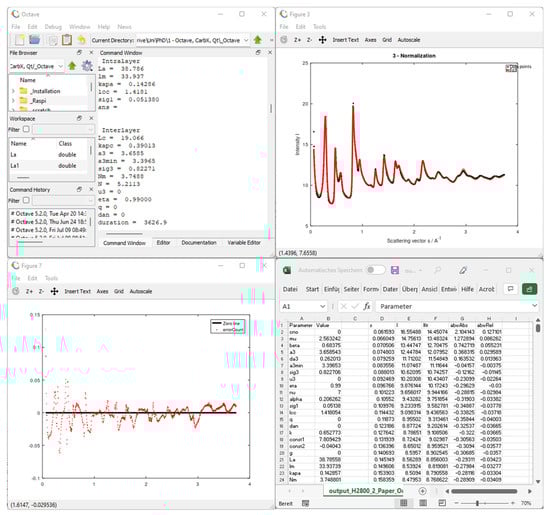 To use OctCarb for the refinement of the WAXS/WANS data of non-graphitic carbons, first Octave and the optim package must be installed. During the installation of Octave, the chosen installation path should not contain empty spaces (“ “), otherwise, problems during the installation of the optim package might occur. For example, a safe path would be “C:/Octave/Octave-6.3.0”. Next, the iObs.oct file must be downloaded (or self-compiled) as described in the SI File (part A) in S7 and in the GitHub (https://github.com/osswaldo/NGCs/tree/master/Octave/oct-files (accessed on 2 November 2022)). Third, the file Fit-Routine.m must be downloaded and modified for the required purpose, e.g., with respect to the sample name and measurement data path. An example for starting the algorithm and the operations can be found in the “Excerpt from GitHub” (SI). After opening Octave, the example script can be loaded either using File → Open or the shortcut in the upper toolbar. In Figure 3, the basic graphical user interface (GUI), and in Figure 4, the results of a typical refinement using OctCarb are shown: In addition to the microstructure parameters in text form, Octave/OctCarb plots the experimental data, the refined fitting curve as well as their deviation, and saves all these data in a CSV file.