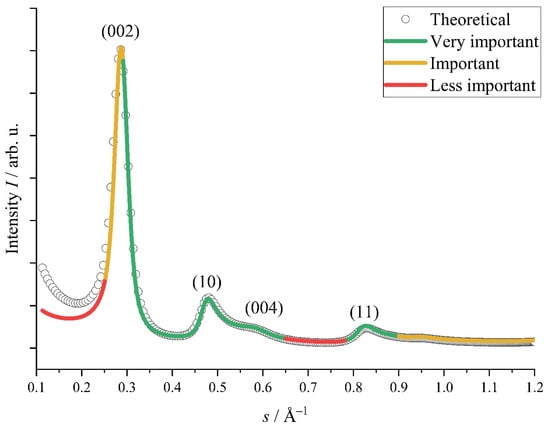 Figure 5 shows an exemplary WAXS pattern and a reasonable fitting result, proving the applicability of OctCarb to typical experimental data. However, in some cases a refinement might not fit the data over the entire range of WAXS/WANS data, in particular with respect to two issues, namely, the course of the data curve at small s and the background scattering. Yet we found that a meaningful and precise determination of the main structural parameters such as the average stack height (Lc) or the average layer extension (La) does not require a reasonable fitting of the entire data set, i.e., a deviation between the data and the fitting function in certain parts is tolerable. Figure 5 highlights the importance of the various parts along the s-axis in assessing the quality of a fitting, which is valid for most samples studied. In plain terms: even if the red regions (Figure 5) are not well fitted, still the structural parameters are reliably determined. On the other side, the green regions must be well fitted in order to obtain reliable and meaningful parameter values.