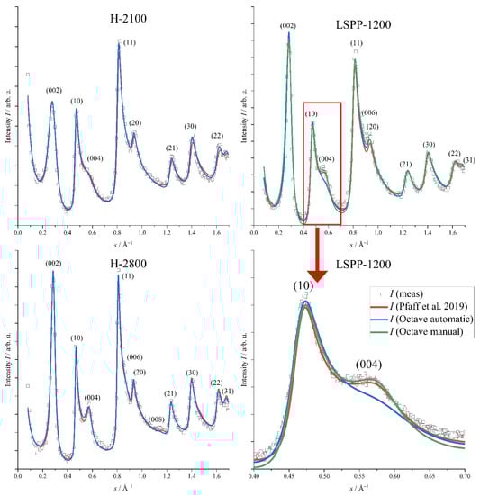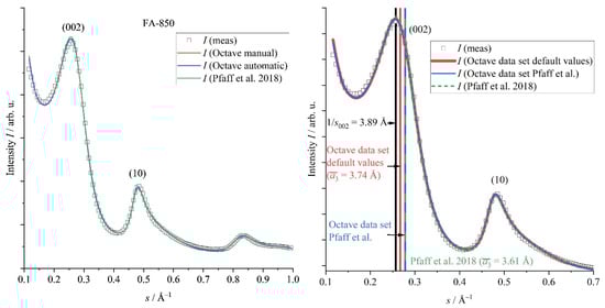 In detail, we now compare the evaluation of WAXS data by Octave and the study of Pfaff et al. [] by the closer inspection of the sample FA-850 as an exemplary case (Figure 6). As already mentioned, there are significant differences in the resulting parameters (Table S3), which can be correlated to the quality of the fit in this case. The fitting curve of Pfaff et al. [] is shifted slightly, but systematically to higher intensities than the data points in the region of the (002) reflection, and a little lower in the range of the (10) reflection (Figure 6), which might explain the significant differences seen in La and Lc. By contrast, fitting by OctCarb provides an almost perfect fit in these regions, demonstrating the superiority of a rigorous mathematical fitting algorithm.