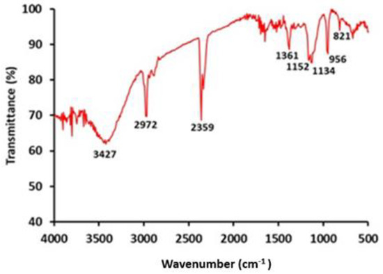 The FTIR spectrum of GO from grape seed biochar (Figure 1) that was observed was similar to the FTIR spectrum of the GO from commercial graphite. The strong peak around 3400 cm−1 can be attributed to the O–H stretching vibrations of the C–OH groups and water [22], band in the 2970 cm−1 region that are associated with the symmetric elongation of CH2 [23], the C=C=O stretching vibrations at 2359 cm−1 [7], the vibration band of epoxy group (1300 cm−1) [7,23], as well as the strong band located at 1151 cm−1 (C–OH stretching vibrations) [24].