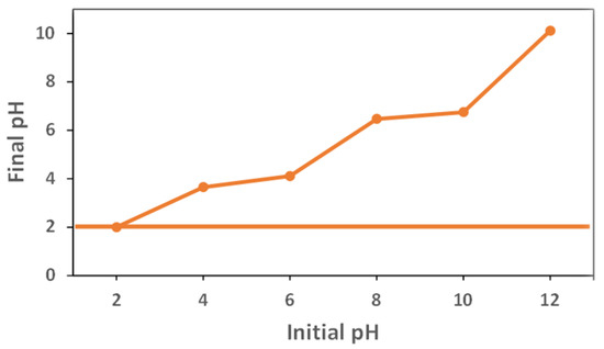 The point of zero charge (pHzpc) was determined to investigate the surface charge of the graphene oxide. The graphene oxide derived from the biochar of seed grape showed acidic pHzpc, with a value of 2 (Figure 2). The determination of the pHzpc is important because the pH affects the adsorption process. In solutions with a pH below the point of zero charge, the surface of the graphene oxide is positively charged; consequently, the opposite behavior on the solution pH is greater than the pHzpc, and the surface of the graphene oxide is negatively charged [19].