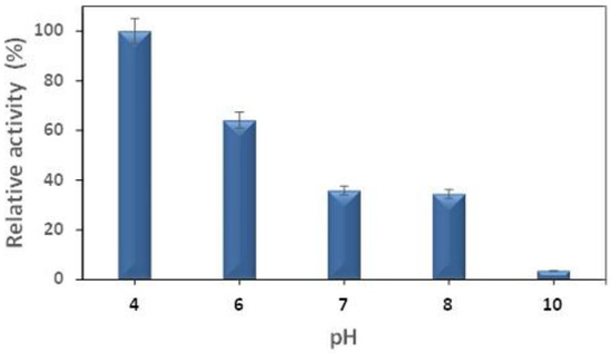 The influence of the pH on the physical adsorption immobilization process of the BCL on the GO is shown in Figure 3. The pH of the solution changes the surface charge of the support and the electrostatic charge on the surface of the BCL, showing a significant parameter that affects the immobilization process. Higher activity in the derivative (543 ± 52 U/g of support), displayed in Supplementary Materials (Table S1), was observed at a pH 4.0, showing a decreasing profile with increasing the pH. The point of zero charge, the pHzpc of graphene oxide, was found to be 2.0, and the surface is negatively charged when the solution pH is greater than the pHzpc. The isoelectric point of this lipase was 6.22 [25]. Consequently, the charges of the BCL residues are expected to be primarily positive at a a pH lower than 6.22 and negative at a higher pH. Consequently, the charges of the BCL residues are found to be mainly positive at an acidic pH and the contrary at an alkaline pH.